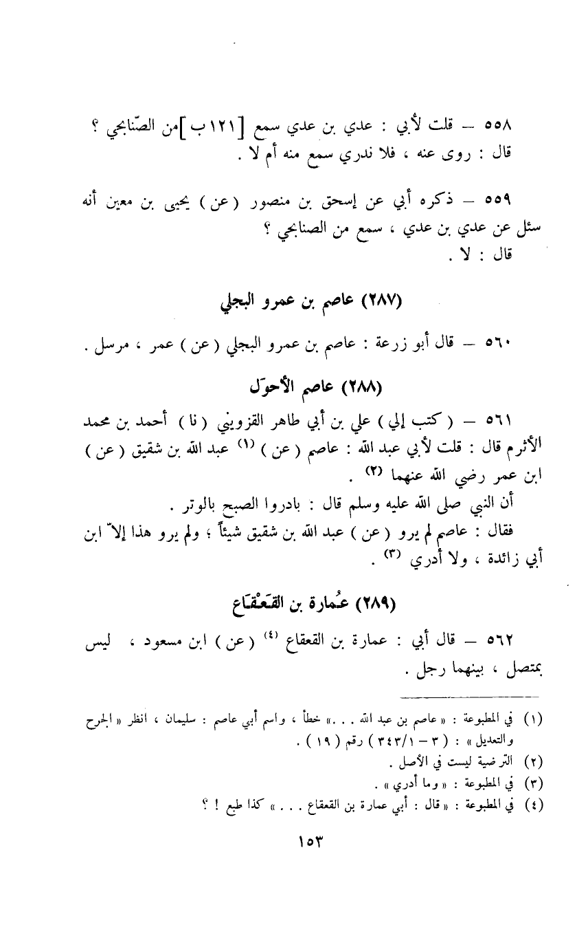 561 - كَتَبَ إِلَيَّ عَلِيُّ بْنُ أَبِي طَاهِرٍ الْقَزْوِينِيُّ نَا أَحْمَدُ بْنُ مُحَمَّدٍ الْأَثْرَمِ قَالَ قُلْتُ لِأَبِي عَبْدِ اللَّهِ عَاصِمُ عَنْ عَبْدِ اللَّهِ بْنِ شَقِيقٍ عَنِ ابْنِ عُمَرَ رَضِيَ اللَّهُ عَنْهُمَا أَنّ النَّبِيَّ صَلَّى اللَّهُ عَلَيْهِ وَسَلَّمَ قَالَ بَادِرُوا الصُّبْحَ بِالْوَتْرِ فَقَالَ عَاصِمُ لَمْ يَرِو عَنْ عَبْدِ اللَّهِ بْنِ شَقِيقٍ شَيْئًا َوَلْم َيِرو هَذَا إِلَّا ابْنُ أَبِي زَائِدَةَ وَلَا أَدْرِي