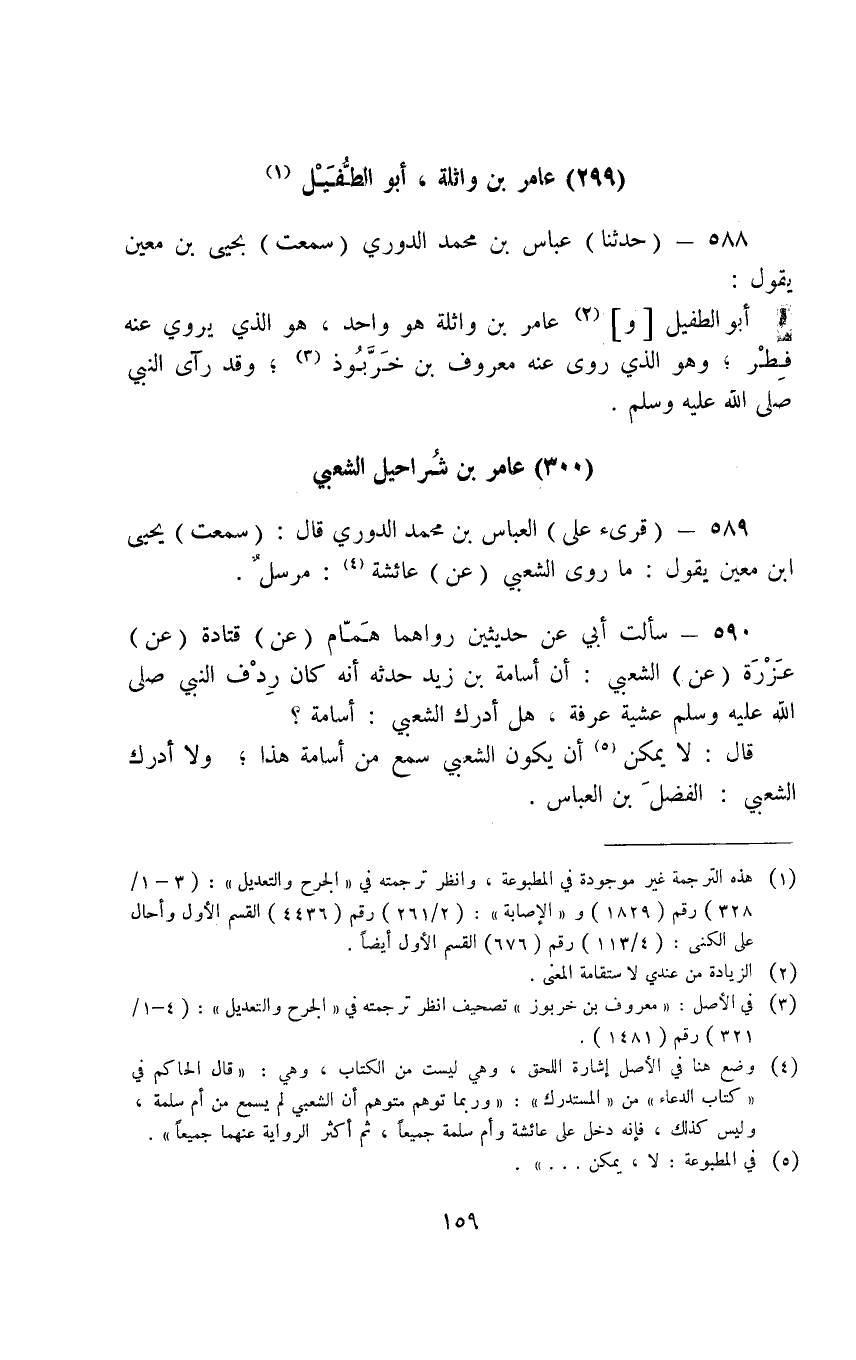 589 - قرىء عَلَى الْعَبَّاسِ بْنِ مُحَمَّدٍ الْدُّورِيِّ قَالَ سَمِعت يحيى ابْن مَعِينٍ يَقُولُ مَا رَوَى الشَّعْبِيُّ عَنْ عَائِشَةَ مَرْسَلٌ