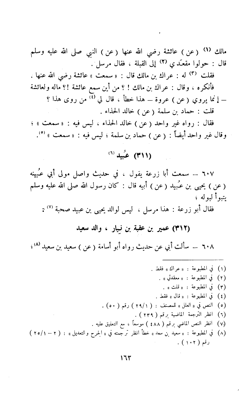 607 - سَمِعْتُ أَبَا زُرْعَةَ َيَقُولُ فِي حَدِيثِ وَاصِلٍ مَوْلَى أَبِي عُيَيْنَةَ عَنْ يَحْيَى بْنِ عُبَيْدٍ عَنْ أَبِيهِ قَالَ كَانَ رَسُولُ اللَّهِ صَلَّى اللَّهُ عَلَيْهِ وَسَلَّمَ يَتَبَوَّأُ لِبَوْلِهِ فَقَالَ أَبُو زُرْعَةَ هَذَا مُرْسَلٌ لَيْسَ لِوَالِدِ يَحْيَى بْنِ عُبَيْدٍ صُحْبَةٌ