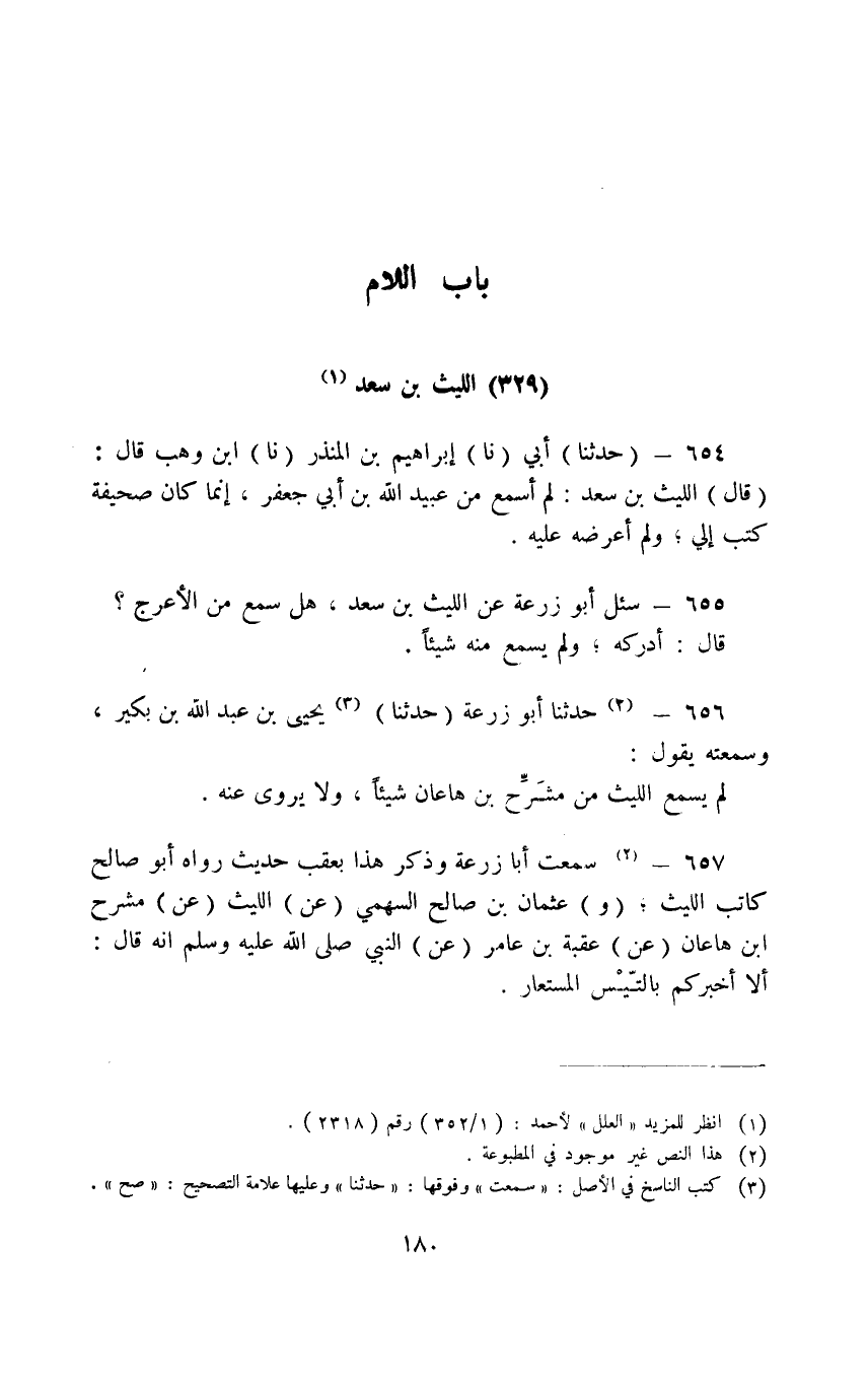 655 - سُئِلَ أَبُو زُرْعَةَ عَنِ اللَّيْثِ بْنِ سَعْدٍ هَلْ سَمِعَ مِنَ الْأَعْرَجِ قَالَ أَدْرَكَهُ وَلَمْ يَسْمَعْ مِنْهُ شَيْئًا