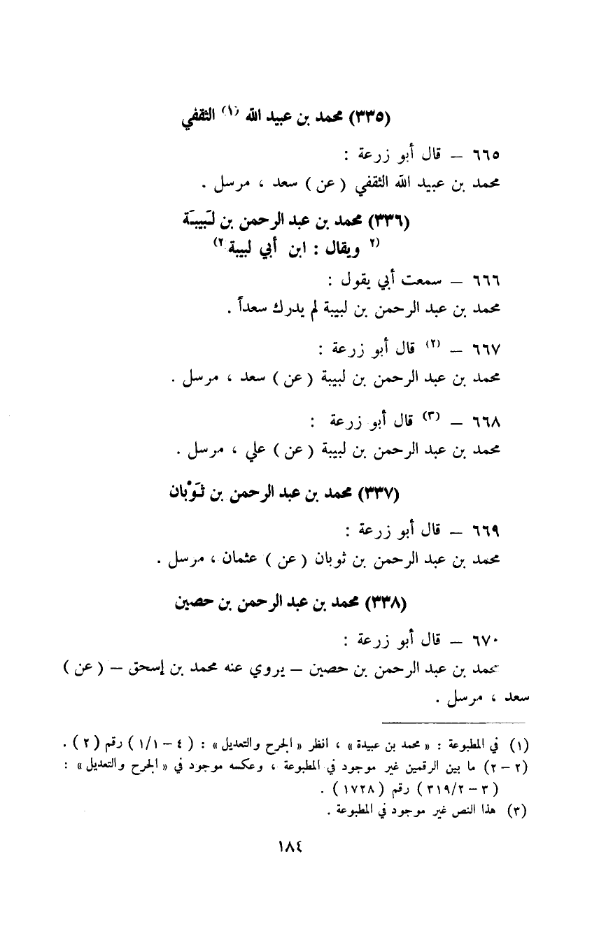 668 - قَالَ أَبُو زُرْعَةَ مُحَمَّدُ بْنُ عَبْدِ الرَّحْمَنِ بْنِ لَبِيبَةَ عَنْ عَلِيٍّ مُرْسَلٌ
