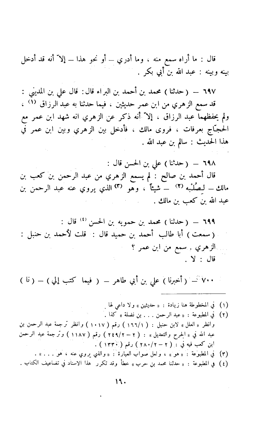699 - حَدَّثَنَا مُحَمَّدُ بْنُ حَمْوَيْهَ بْنِ الْحَسَنِ قَالَ سَمِعْتُ أَبَا طَالِبٍ أَحْمَدَ بْنَ حُمَيْدٍ قَالَ قُلْتُ لِأَحْمَدَ بْنُ حَنْبَلٍ الزُّهْرِيُّ سَمِعَ مِنْ ابْنِ عُمَرَ قَالَ لَا
