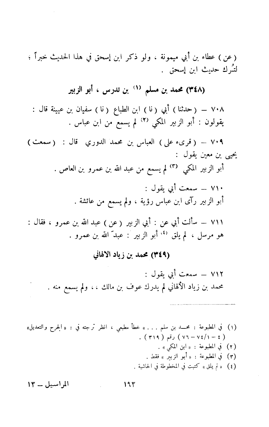 711 - سَأَلْتُ أَبِي عَنْ أَبِي الزُّبَيْرِ عَنْ عَبْدِ اللَّهِ بْنِ عَمْرٍو فَقَالَ هُوَ مُرْسَلٌ لَمْ يَلْقَ أَبُو الزُّبَيْرِ عَبْدَ اللَّهِ بْنَ عَمْرٍو