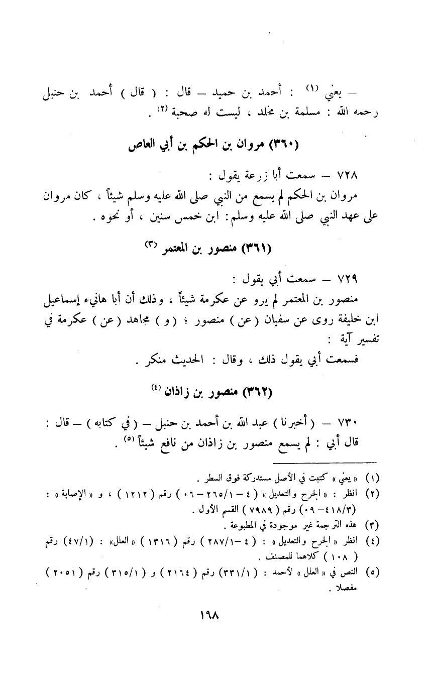 730 - أَخْبَرَنَا عَبْدُ اللَّهِ بْنُ أَحْمَدَ بْنِ حَنْبَلٍ فِي كِتَابِهِ قَالَ قَالَ أَبِي لَمْ يَسْمَعْ مَنْصُورُ بْنُ زذان من نَافِع شَيْئا