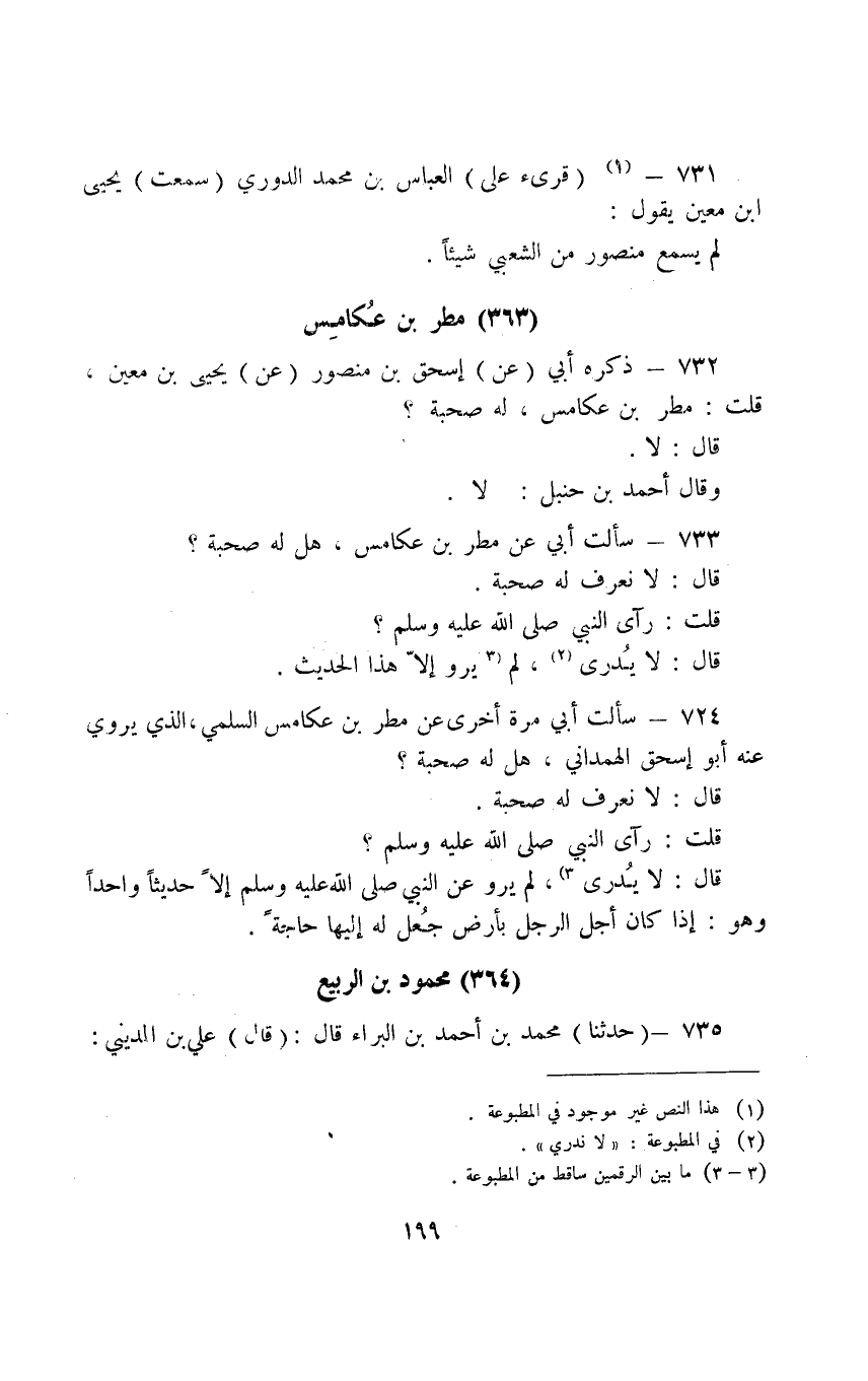 731 - قُرِى عَلَى الْعَبَّاسِ بْنِ مُحَمَّدٍ الدوري سَمِعت يحيى ابْن مَعِينٍ يَقُولُ لَمْ يَسْمَعْ مَنْصُورُ مِنَ الشَّعْبِيِّ شَيْئًا
