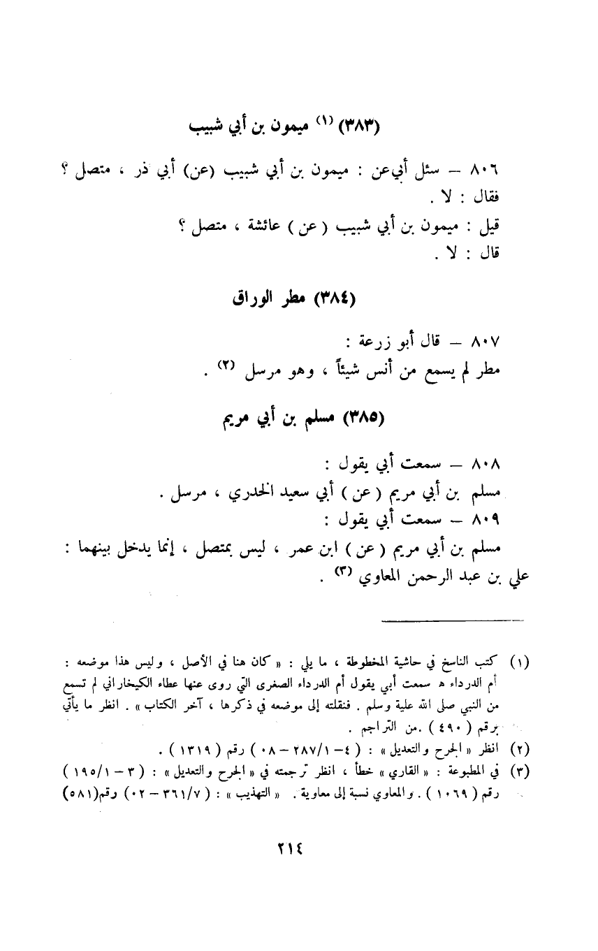 805 - سُئِلَ أَبِي عَنْ مَيْمُونِ بْنِ أَبِي شَبِيبٍ عَنْ أَبِي ذَرٍّ مُتَّصِلُ فَقَالَ لَا قِيلَ مَيْمُونُ بْنُ أَبِي شَبِيبٍ عَنْ عَائِشَةَ مَتَّصِلٌ قَالَ لَا