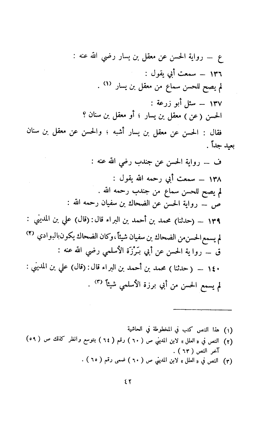 139 - حَدَّثَنَا مُحَمَّدُ بْنُ أَحْمَدَ بْنِ الْبَرَاءِ قَالَ قَالَ عَلِيُّ بْنُ الْمَدِينِيِّ لَمْ يَسْمَعِ الْحَسَنُ مَنَ الضَّحَّاكِ بْنِ سُفْيَانَ شَيْئًا وَكَانَ الضَّحَّاكُ يَكُونُ بِالْبَوَادِي ق رِوَايَةُ الْحَسَنِ عَنْ أَبِي بَرْزَةَ الْأَسْلَمِيِّ رَضِيَ اللَّهُ عَنْهُ