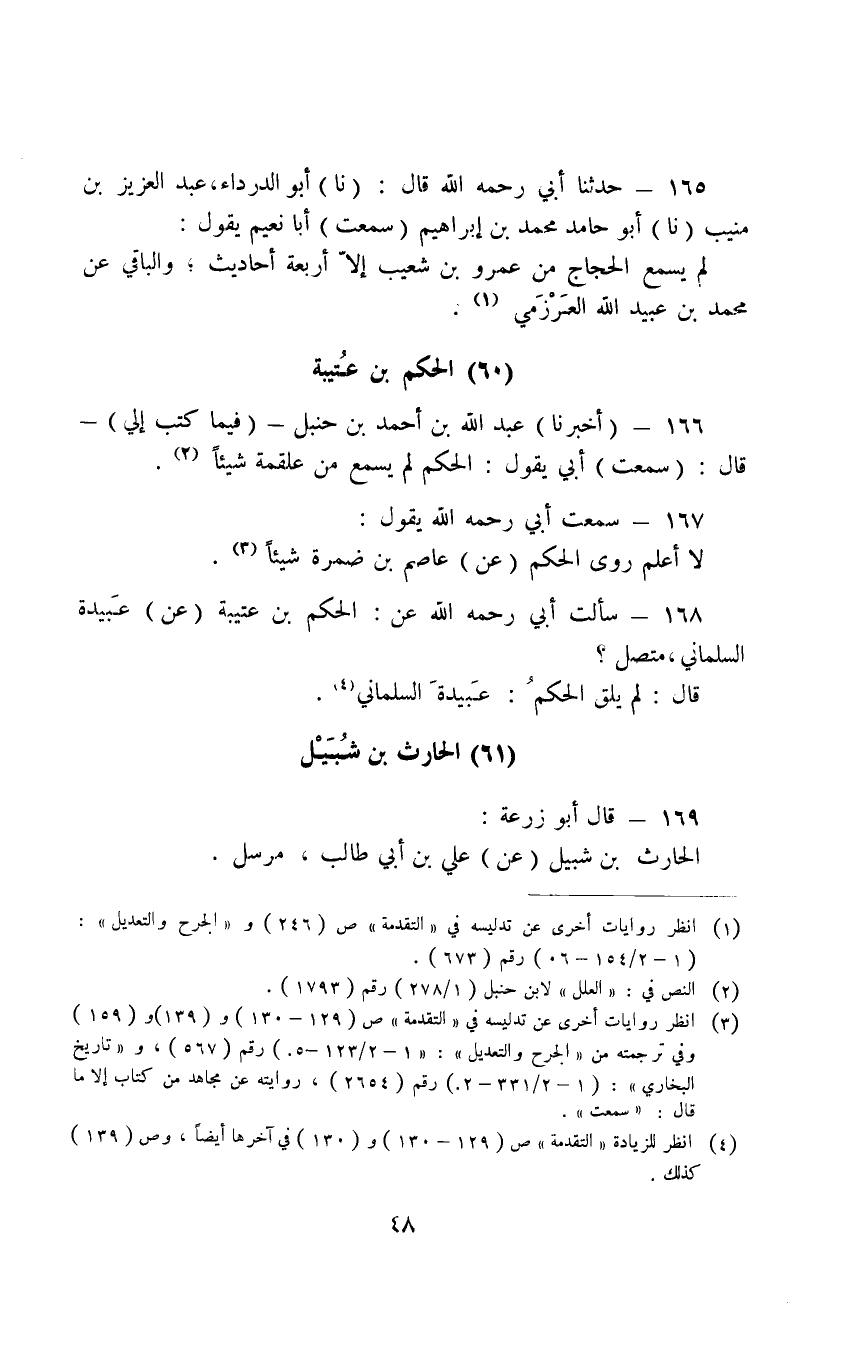 168 - سَأَلْتُ أَبِي رَحِمَهُ اللَّهُ عَنِ الْحَكَمِ بْنِ عُتَيْبَةَ عَنْ عُبَيْدَةَ السَّلْمَانِيِّ مُتَّصِلٍ قَالَ لَمْ يَلْقَ الْحَكَمُ عُبَيْدَةَ السَّلْمَانِيَّ