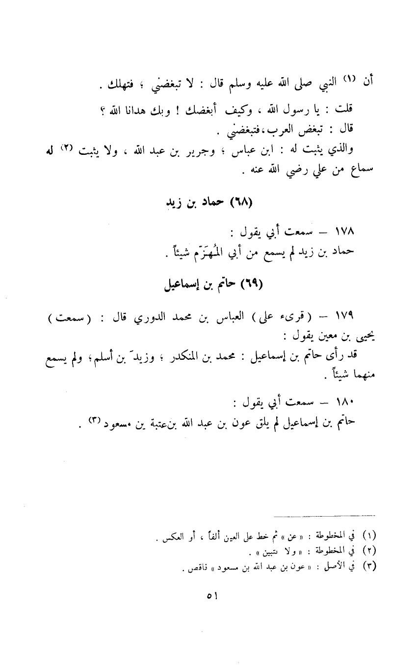 179 - قرىء عَلَى الْعَبَّاسِ بْنِ مُحَمَّدٍ الْدُّورِيِّ قَالَ سَمِعْتُ يَحْيَى بْنَ مَعِينٍ يَقُولُ قَدْ رَأَى حَاتِمُ بْنُ إِسْمَاعِيلَ مُحَمَّدَ بْنَ الْمُنْكَدِرْ وَزَيْدَ بْنَ أَسْلَمَ وَلْم يَسْمَعْ مِنْهُمَا شَيْئًا