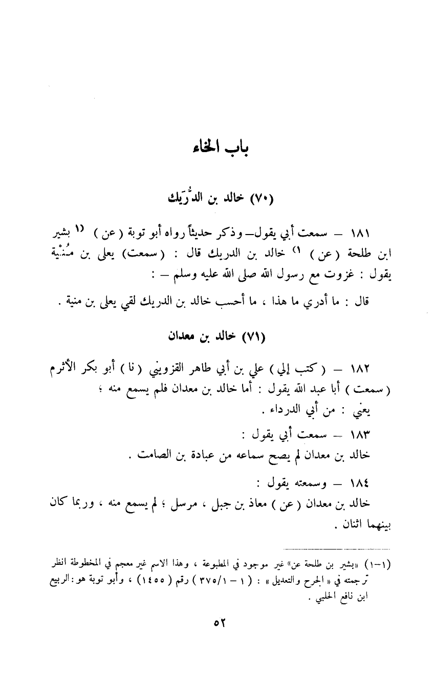 182 - كَتَبَ إِلَيَّ عَلِيُّ بْنِ أَبِي طَاهِرٍ الْقَزْوِينِيِّ نَا أَبُو بَكْرٍ الْأَثْرَمُ سَمِعْتُ أَبَا عَبْدِ اللَّهِ يَقُولُ أَمَّا خَالِدُ بْنُ مَعْدَانَ فَلَمْ يَسْمَعْ مِنْهُ يَعْنِي مِنْ أَبِي الدَّرْدَاءِ