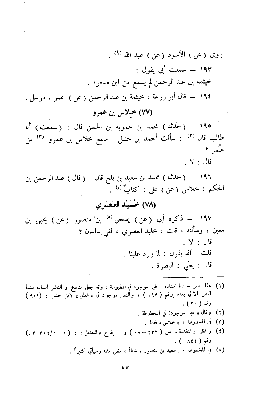 197 - ذَكَرَهُ أَبِي عَن إِسْحَق بْنِ مَنْصُورٍ عَنْ يَحْيَى بْنِ مَعِينٍ وَسَأَلْتُهُ قُلْتُ خُلَيْدُ الْعَصَرِيُّ لَقِيَ سَلْمَانَ قَالَ لَا قَلْتُ إِنَّهُ يَقُولُ لَمَّا وَرَدَ عَلَيْنَا قَالَ يَعْنِي الْبَصْرَةَ