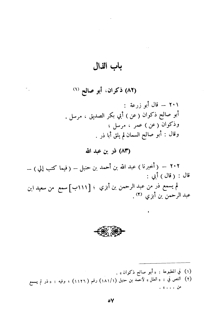 201 - قَالَ أَبُو زُرْعَةَ أَبُو صَالِحٍ ذَكْوَانُ عَنْ أَبِي بَكْرٍ الصِّدِّيقِ مُرْسِلٌ وَذَكْوَانُ عَنْ عُمَرَ مُرْسَلٌ وَقَالَ أَبُو صَالِحٍ السَّمَّانَ لَمْ يَلْقَ أَبَا ذَرٍّ