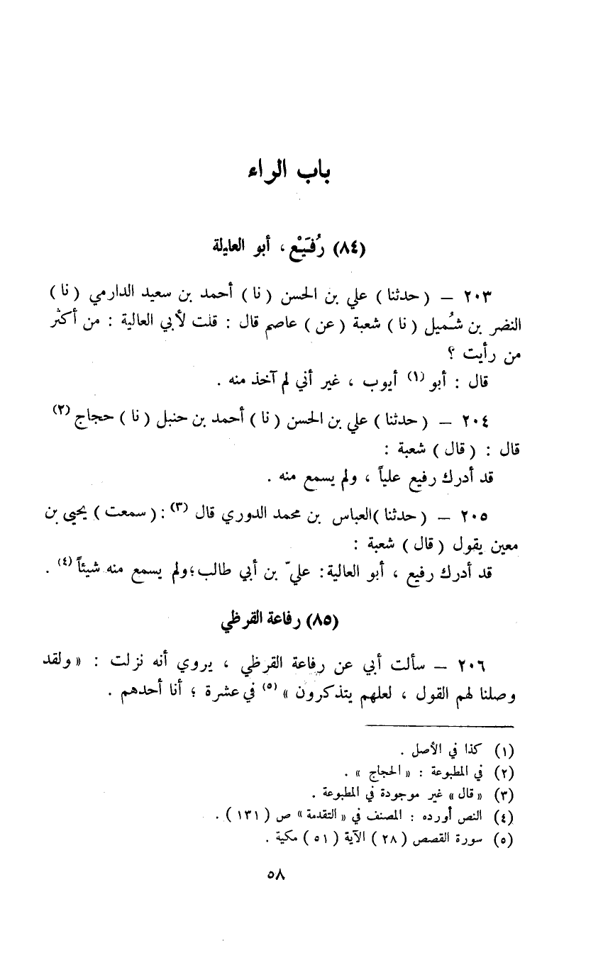 205 - حَدَّثَنَا الْعَبَّاسُ بْنِ مُحَمَّدٍ الْدُّورِيِّ قَالَ سَمِعْتُ يَحْيَى بْنَ مَعِينٍ يقَوُل قَالَ شُعْبَةُ قَدْ أَدْرَكَ رُفَيْعُ أَبُو الْعَالِيَةِ عَلِيَّ بْنَ أَبِي طَالِبٍ وَلَمْ يَسْمَعْ مِنْهُ شَيْئًا