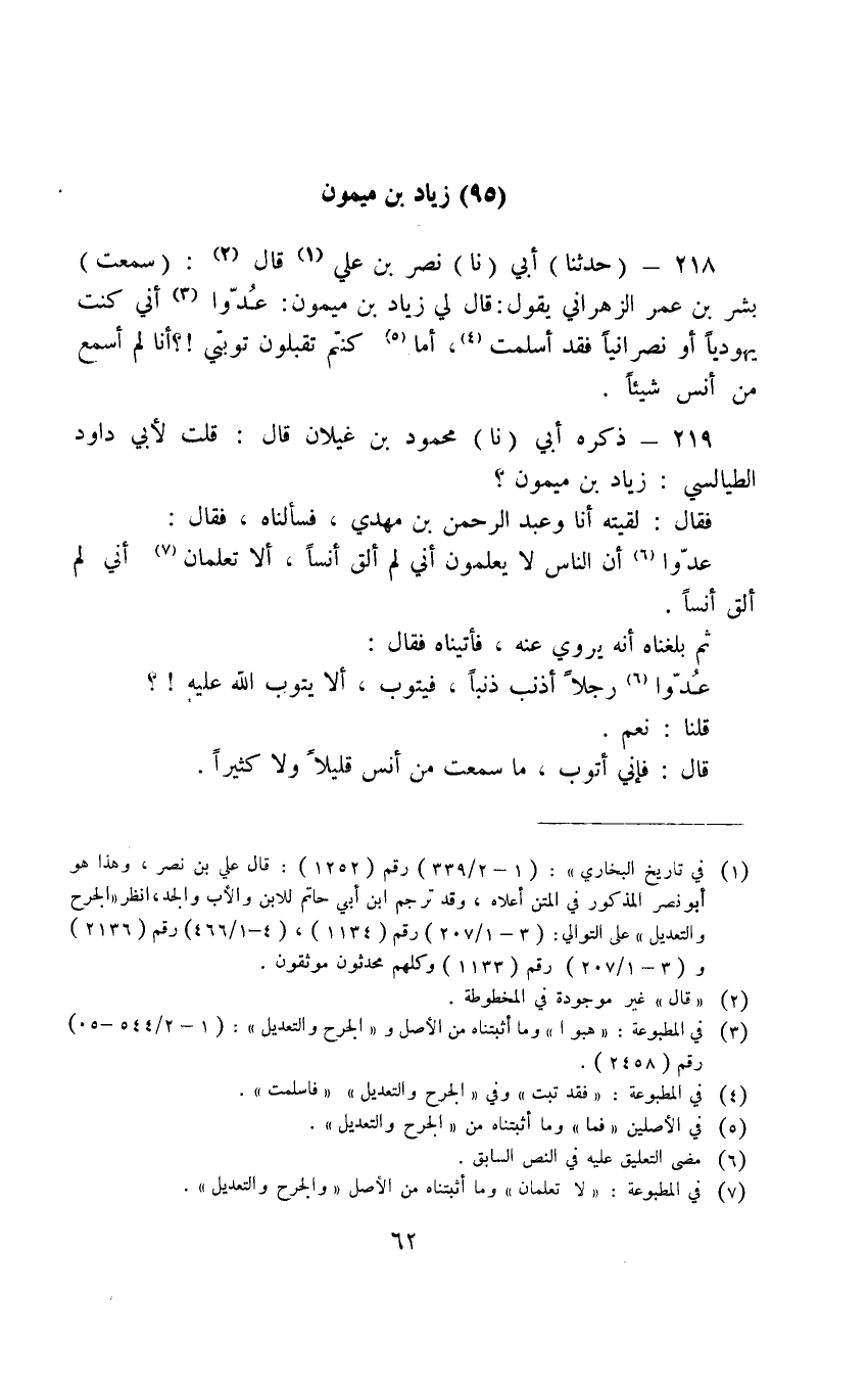 219 - ذَكَرَهُ أَبِي نَا مَحْمُودُ بْنُ غَيْلَانَ قَالَ قُلْتُ لِأَبِي دَاودَ الطَّيَالِسِيِّ زِيَادُ بْنُ مَيْمُون فَقَالَ لَقِيتُهُ أَنَا وَعَبْدُ الرَّحْمَنِ بْنُ مَهْدِيِّ فَسَأَلْنَاهُ فَقَالَ عُدُّوا أَنَّ النَّاسَ لَا يَعْلَمُونَ أَنِّي لَمْ أَلْقَ أَنَسًا أَلَا تَعْلَمَانِ أَنِّي لَمْ أَلْقَ أَنَسًا ثُمَّ بَلَّغْنَاهُ أَنَّهُ يَرْوِي عَنْهُ فَأَتَيْنَاهُ فَقَالَ عُدُّوا رَجُلًا أَذْنَبَ ذَنْبًا فَيَتُوبُ أَلَا يَتُوبُ اللَّهُ عَلَيْهِ قَلْنَا نَعَمْ قَالَ فَإِنِّي أَتُوبُ مَا سَمِعْتُ مِنْ أَنَسٍ قَلِيلًا وَلَا كَثِيرًا فَكَانَ بَعْدَ ذَلِكَ يَبْلُغُنَا عَنْهُ أَنَّهُ يَرْوِي عَنْهُ فَتَرْكَناُه