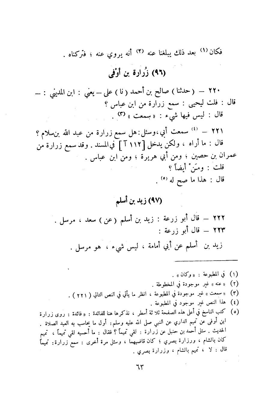 221 - سَمِعْتُ أَبِي وَسُئِلَ هَلْ سَمِعَ زُرَارَةُ مِنْ عَبْدِ اللَّهِ بْنِ سَلَامٍ قَالَ مَا أُرَاهُ وَلَكِنْ يَدْخُلُ فِي الْمُسْنَدِ وَقَدْ سَمِعَ زُرَارَةُ مِنْ عِمْرَانَ بْنِ حُصَيْنٍ وَمِنْ أَبِي هُرَيْرَةَ وَمِنِ ابْنِ عَبَّاسٍ قُلْتُ وَمَنْ أَيْضًا قَالَ هَذَا مَا صَحَّ لَهُ