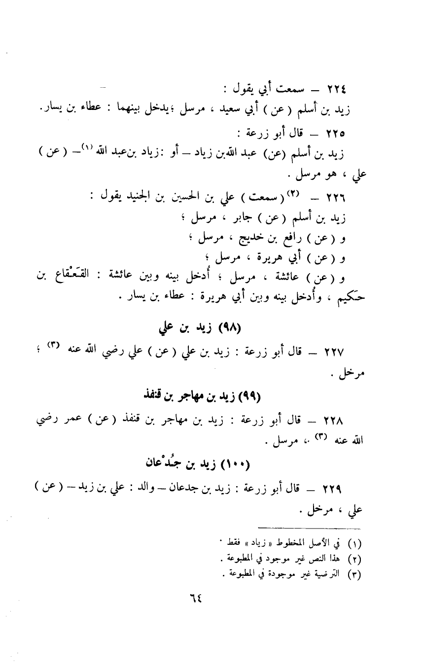 226 - سَمِعْتُ عَلِيَّ بْنَ الْحَسَيِن بْنِ الْجُنَيْدِ يَقُولُ زَيْدُ بْنُ أَسْلَمَ عَنْ جَابِرٍ مُرْسَلٌ وَعَنْ رَافِعَ بْنِ خُدَيْجٍ مُرْسَلٌ وَعَنْ أَبِي هُرَيْرَةَ مُرْسَلٌ وَعَنْ عَائِشَةَ مُرْسَلٌ أُدْخِلَ بَيْنَهُ وَبَيْنَ عَائِشَةَ الْقَعْقَاعُ بْنُ حَكِيمٍ وَأُدْخِلَ بَيْنَهُ وَبَيْنَ أَبِي هُرَيْرَةَ عَطَاءُ بْنُ يَسَارٍ