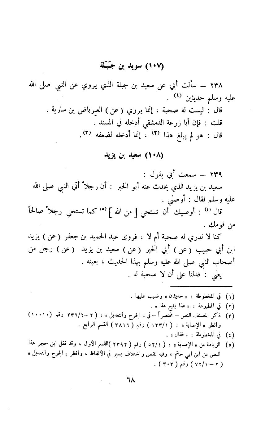 238 - سَأَلْتُ أَبِي عَنْ سعيد بْنُ جَبَلَةَ الَّذِي يَرْوِي عَنِ النَّبِيِّ صَلَّى اللَّهُ عَلَيْهِ وَسَلَّم حَدِيثَيْنِ قَالَ لَيْسَتْ لَهُ صُحْبَةٌ إِنَّمَا يَرْوِي عَنِ الْعِرْبَاضِ بْنِ سَارِيَةَ قُلْتُ فَإِنَّ أَبَا زُرْعَةَ الدِّمِشْقِيِّ أَدْخَلَهُ فِي الْمُسْنَدِ قَالَ هُوَ لَمْ يَبْلُغْ هَذَا إِنَّمَا أَدْخَلَهُ لِضَعْفِهِ