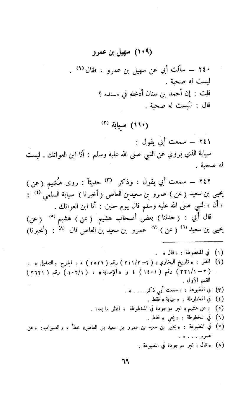 240 - سَأَلْتُ أَبِي عَنْ سُهَيْلٍ بْنِ عَمْرٍو فَقَالَ لَيْسَتْ لَهُ صُحْبَةٌ قُلْتُ إِنَّ أَحْمَدَ بْنَ سِنَانَ أَدْخَلَهُ فِي مُسْنَدِهِ قَالَ لَيْسَتْ لَهُ صُحْبَةٌ