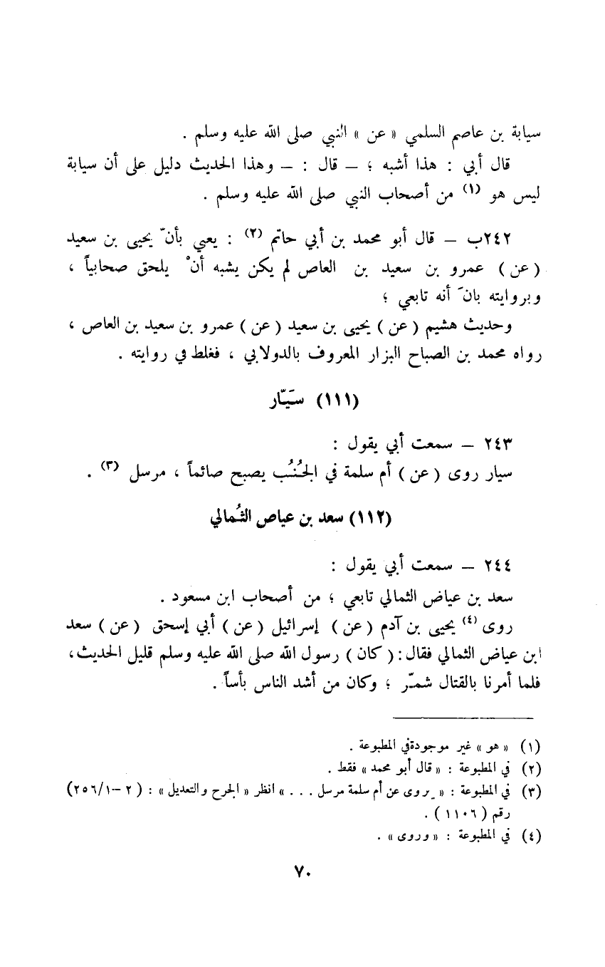 243 - سَمِعْتُ أَبِي يُقوُل سَّياُر رَوَى عَنْ أَمِّ سَلَمَةَ فِي الْجُنُبِ يَصْبِحُ صَائِمًا مُرْسَلٌ