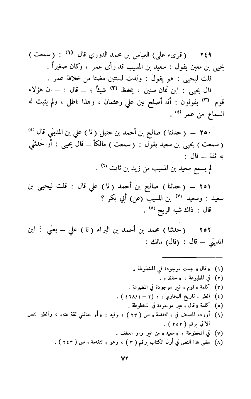 249 - قرىء عَلَى الْعَبَّاسِ بْنِ مُحَمَّدٍ الْدُّورِيِّ قَالَ سَمِعْتُ يَحْيَى بْنَ مَعِينٍ يَقُولُ سَعِيدُ بْنُ الْمُسَيِّبِ قَدْ رَأَى عُمَرَ وَكَانَ صَغِيرًا قُلْتُ لِيَحْيَى هُوَ يَقُولُ وُلِدْتُ لِسَنَتَيْنِ مَضَتَا مِنْ خِلَافَةِ عُمَرَ قَالَ يَحْيَى ابْنُ ثَمَانِ سِنِينَ يَحْفَظُ شَيْئًا قَالَ إِنَّ هَؤُلَاءِ قَومٌ يَقُولُونَ أَنَّهُ أَصْلَحُ بَيْنَ عَلِيٍّ وَعُثْمَانَ وَهَذَا بَاطِلٌ وَلَمْ يَثْبُتُ لَهُ السَّمَاعُ مِنْ عُمَرَ