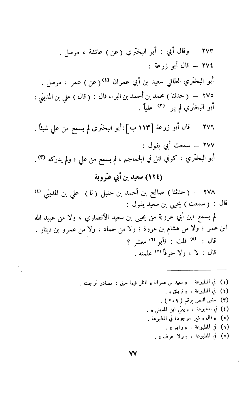 278 - حَدَّثَنَا صَالِحُ بْنُ أَحْمَدَ بْنِ حَنْبَلٍ نَا عَلِيُّ بْنُ الْمَدِينِيِّ قَالَ سَمِعْتُ يَحْيَى بْنَ سَعِيدٍ يَقُولُ لَمْ يَسْمَعِ ابْنُ أَبِي عَرْوَبَةَ مِنْ يَحْيَى بْنِ سَعِيدٍ الْأنْصَارِيّ وَلَا من عبيد الله ابْنِ عُمَرَ وَلَا مِنْ هِشَامِ بْنِ عَرْوَةَ وَلَا مِنْ حَمَّادٍ وَلَا ِمْن عَمْرٍو بْنِ دِينَارٍ قَالَ قُلْتُ فَأَبُو مُعَشَّرٍ قَالَ لَا وَلَا حَرْفًا عَلِمْتَهُ