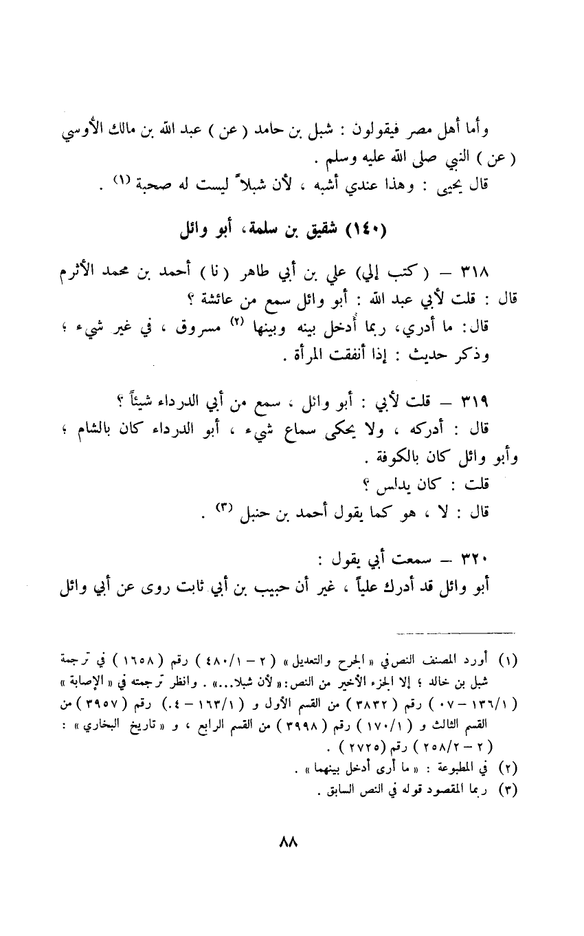 319 - قُلْتُ لِأَبِي أَبُو وَائِلٍ سَمِعَ مِنْ أَبِي الدَّرْدَاءِ شَيْئًا قَالَ أَدْرَكَهُ وَلَا يَحْكِي سَمَاعُ شَيْءٍ أبَوُ الدَّرْدَاءِ كَانَ بِالشَّامِ وَأَبُو وَائِلٍ كاَن َبِالْكُوفَةِ قُلْتُ كَانَ يُدَلِّسُ قَالَ لَا هُوَ كَمَا يَقُولُ أَحْمَدُ بْنُ حَنْبَلٍ