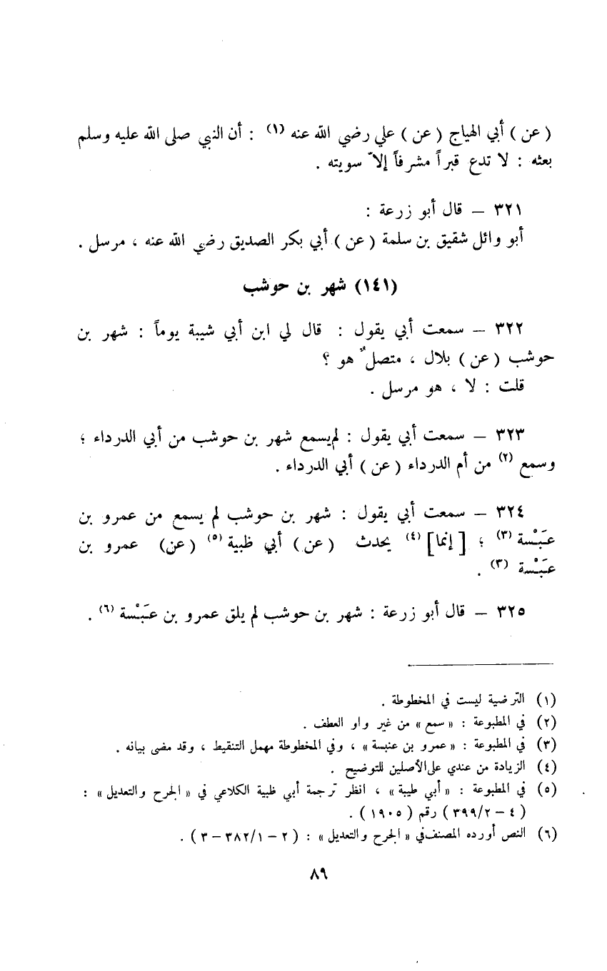 325 - قَالَ أبَوُ زُرْعَةَ شَهْرُ بْنُ حَوْشَبٍ لَمْ يَلْقَ عَمْرَو بْنَ عبسة