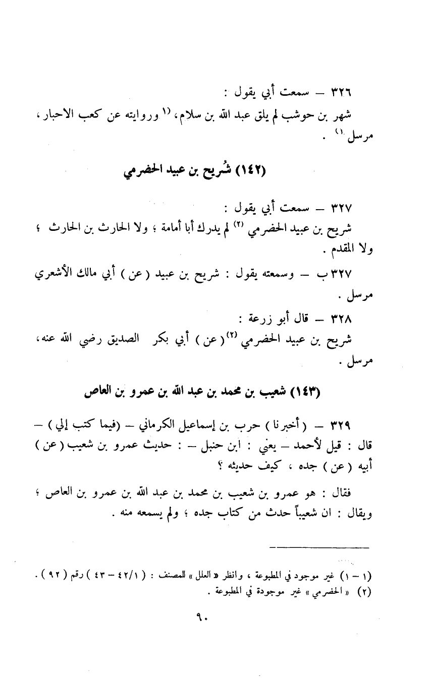 326 - سَمِعْتُ أَبِي يَقُولُ شَهْرُ بْنُ حَوْشَبٍ لَمْ يَلْقَ عَبْدَ اللَّهِ بْنَ سَلَامٍ وَرِوَايَتُهُ عَنْ كَعْبِ الْأَحْبَارِ مُرْسَلٌ