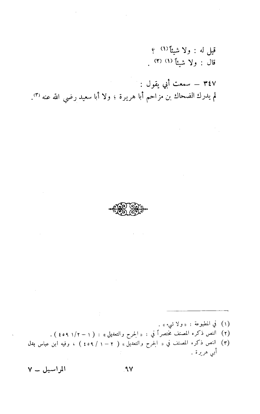 347 - سَمِعْتُ أَبِي يَقُولُ لَمْ يُدْرِكْ الضَّحَّاكُ بْنُ مُزَاحِمٍ أَبَا ُهُرَيْرَةَ وَلَا أَبَا سَعِيدٍ رَضِيَ اللَّهُ عَنْهُ