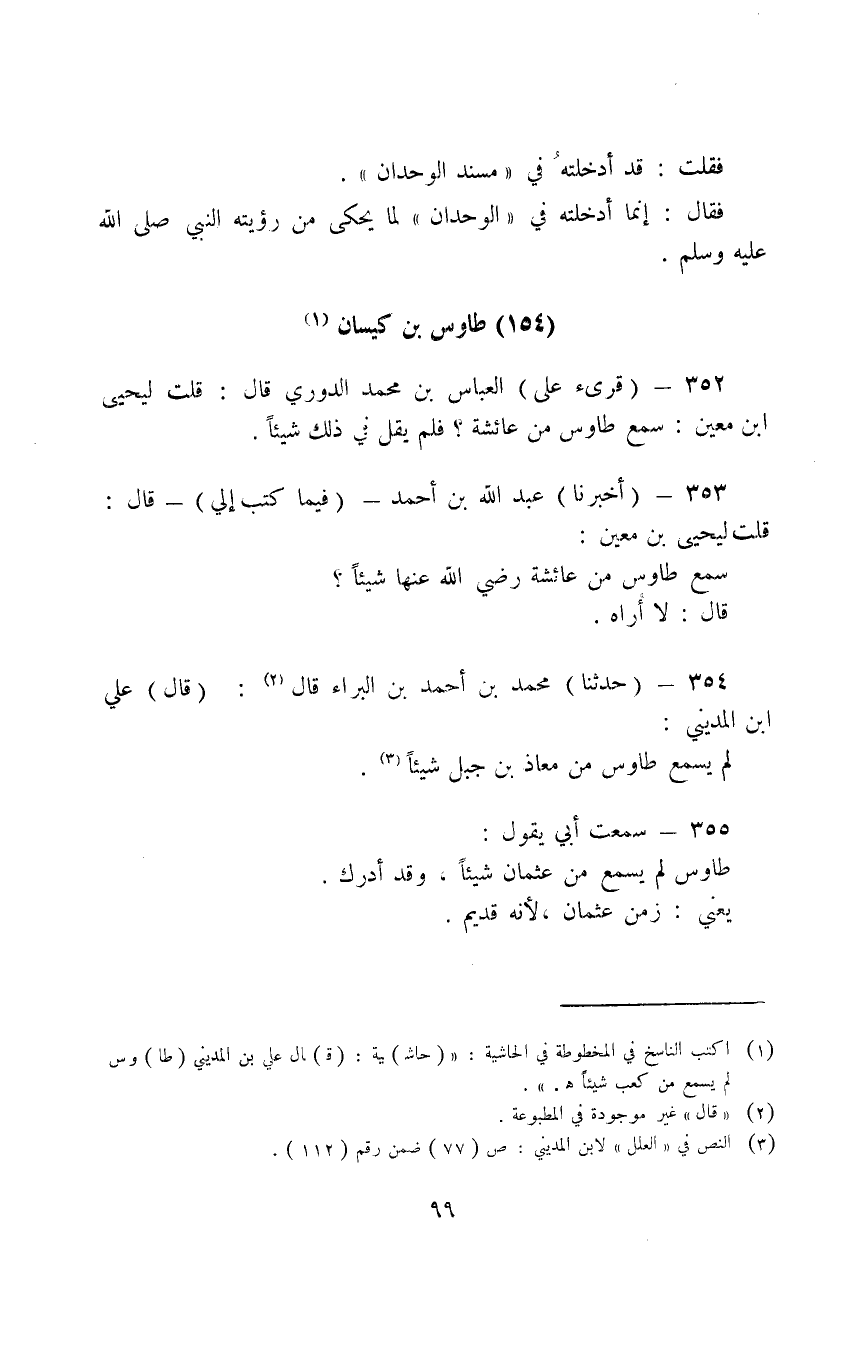 354 - حَدَّثَنَا مُحَمَّدُ بْنُ أَحْمَدَ بْنِ الْبَرَاءِ قَالَ قَالَ عَلِيُّ ابْن الْمَدِينِيِّ لَمْ يَسْمَعْ طَاوسُ مِنْ مُعَاذِ بْنِ جَبَلٍ شَيْئًا