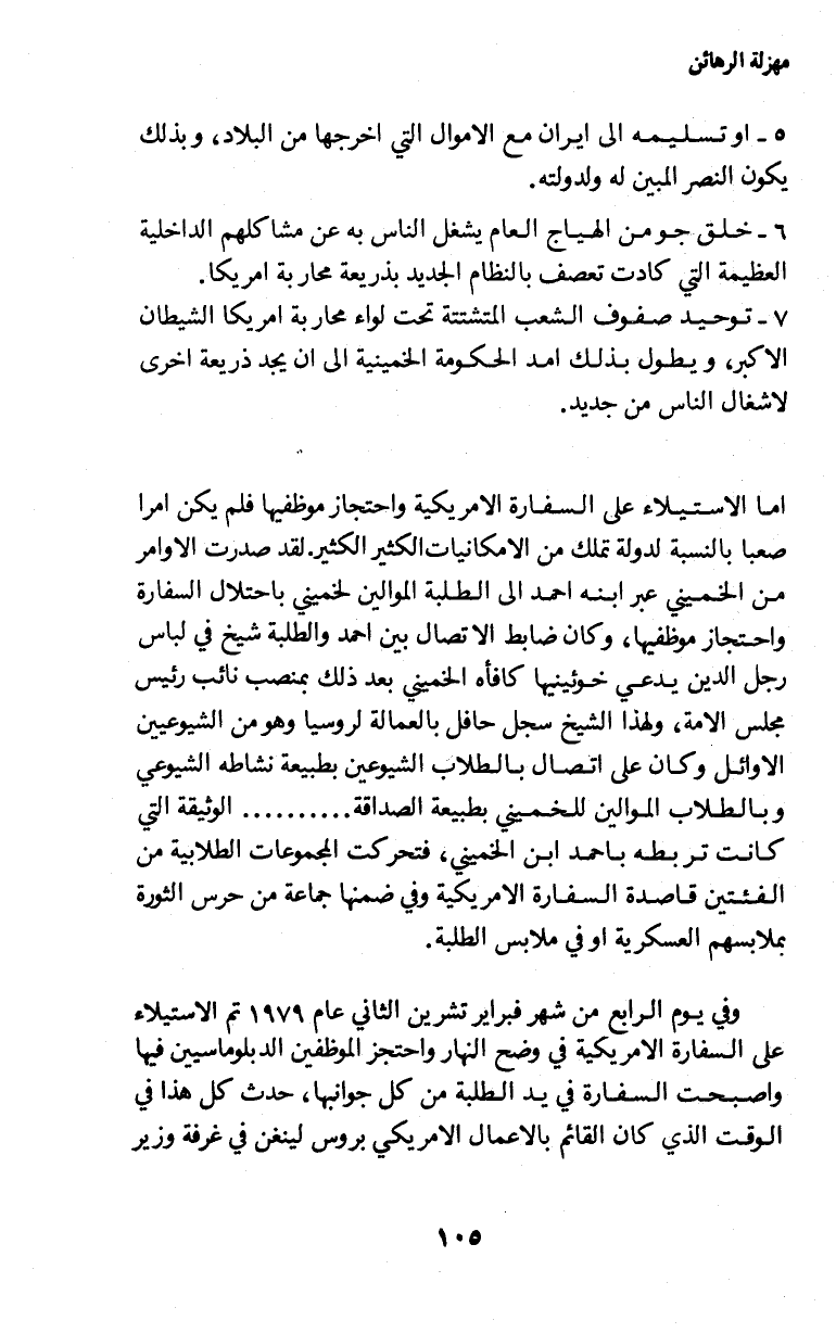 اما الاستيلاء على السفارة الامريكية واحتجاز موظفيها فلم يكن امرا صعبا بالنسبة لدولة تملك من الامكانيات الكثير الكثير. لقد صدرت الاوامر من الخميني عبر ابنه احمد إلى الطلبة الموالين لخميني باحتلال السفارة واحتجاز موظفيها، وكان ضابط الاتصال بين احمد والطلبة شيخ في لباس رجل الدين يدعي خوئينيها كافأه الخميني بعد ذلك بمنصب نائب رئيس مجلس الامة، ولهذا الشيخ سجل حافل بالعمالة لروسيا وهو من الشيوعيين الاوائل وكان على اتصال بالطلاب الشيوعيين بطبيعة نشاطه الشيوعي وبالطلاب الموالين للخميني بطبيعة الصداقة ... الوثيقة التي كانت تربطه باحمد ابن الخميني، فتحركت المجموعات الطلابية من الفئتين قاصدة السفارة الامريكية وفي ضمنها جماعة من حرس الثورة بملابسهم العسكرية او في ملابس الطلبة.