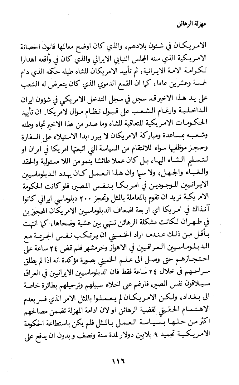 الامريكان في شئون بلادهم، والذي كان اوضح معالمها قانون الحصانة الامريكية الذي سنه المجلس النيابي الايراني والذي كان في واقعه اهدارا لكرامة الامة الايرانية، ثم تأييد الامريكان للشاه طيلة حكمه الذي دام خمسة وعشرين عاما، كما ان القمع الدموي الذي كان يتعرض له الشعب على يد هذا الاخير قد سجل في سجل التدخل الامريكي في شؤون ايران الداخلية وارغام الشعب على قبول نظام موال لامريكا. ان تأييد الحكومات الامريكية المتعاقبة للشاه وما صدر من هذا الاخير تجاه وطنه وشعبه بمساعدة ومباركة الامريكان لايبرر ابدا الاستيلاء على السفارة وحجز موظفيها سواء للانتقام من السياسة التي اتبعتها امريكا في ايران او لتسليم الشاه اليها، بل كان عملا طائشا ينمو من اللا مسئولية والحقد والغباء والجهل، ولا سيما وان هذا العمل كان يهدد الدبلوماسيين الايرانيين الموجودين في امريكا بنفس المصير، فلو كانت الحكومة الامريكية تريد ان تقوم بالمعاملة بالمثل وتحجز 200 دبلوماسي ايراني كانوا آنذاك في امريكا أي اربعة اضعاف الدبلوماسيين الامريكان المحجوزين في طهران لكانت مشكلة الرهائن تنتهي بين عشية وضحاها، كما انتهت بأقل من ذلك عندما اراد الخميني ان يرتكب نفس الجريمة مع الدبلوماسيين العراقيين في الاهواز وخرمشهر فلم تمض 24ساعة على احتجازهم حتى وصل إلى علم الخميني بصورة مؤكدة انه اذا لم يطلق سراحهم في خلال 24 ساعة فقط فان الدبلوماسيين الايرانيين في العراق سيلاقون نفس المصير، فارغم على اخلاء سبيلهم وترحيلهم بطائرة خاصة إلى بغداد، ولكن الامريكان لم يعملوا بالمثل الامر الذي فسر بعدم الاهتمام الحقيقي لقضية الرهائن او لان ادامة المهزلة تضمن مصالحهم اكثر من حلها بسياسة العمل بالمثل فلم يكن باستطاعة الحكومة الامريكية تجميد 9 بلايين دولار لمدة سنة ونصف بدون ان يدفع على