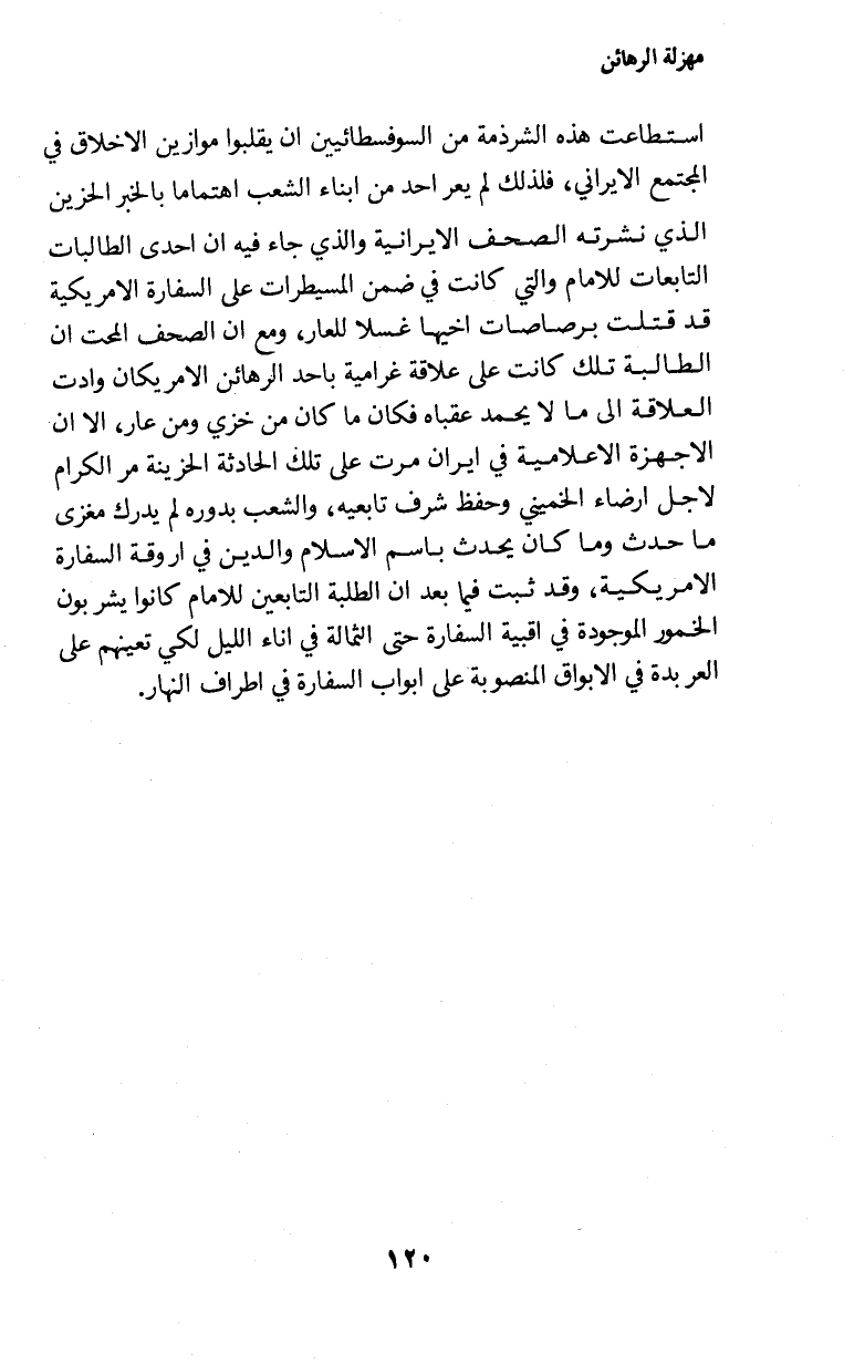 استطاعت هذه الشرذمة من السوفسطائيين ان يقبلوا موازين الاخلاق في المجتمع الايراني، فلذلك لم يعر احد من ابناء الشعب اهتماما بالخبر الحزين الذي نشرته الصحف الايرانية والذي جاء فيه ان احدى الطالبات التابعات للامام والتي كانت ضمن المسيطرات على السفارة الامريكية قد قتلت برصاصات اخيها غسلا للعار، ومع ان الصحف المحت ان الطالبة تلك كانت على علاقة غرامية باحد الرهائن الامريكان وادت العلاقة إلى ما لايحمد عقباه فكان من خزي ومن عار، الا ان الاجهزة الاعلامية في ايران مرت على تلك الحادثة الحزينة مر الكرام لاجل ارضاء الخميني وحفظ شرف تابعيه، والشعب بدوره لم يدرك مغزى ما حدث وما كان يحدث باسم الاسلام والدين في اروقة السفارة الامريكية، وقد ثبت فيما بعد ان الطلبة التابعين للامام كانوا يشربون الخمور الموجودة في اقبية السفارة حتى الثمالة في اناء الليل لكي تعينهم على العربدة في الابواق المنصوبة على ابواب السفارة في اطراف النهار.