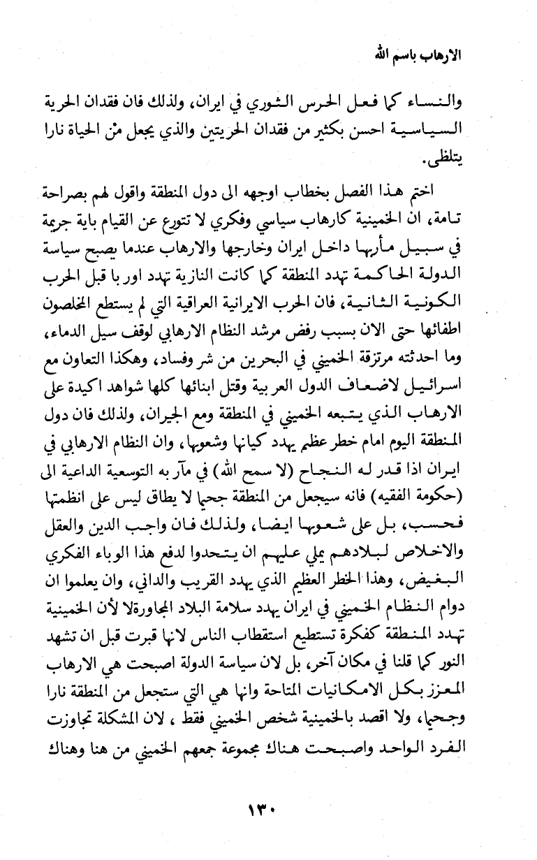 اختم هذا الفصل بخطاب اوجهه إلى دول المنطقة واقول لهم بصراحة تامة، ان الخمينية كارهاب سياسي وفكري لاتتورع عن القيام باية جريمة في سبيل مأربها داخل ايران وخارجها والارهاب عندما يصبح سياسة الدولة الحاكمة تهدد المنطقة كما كانت النازية تهدد اوربا قبل الحرب الكونية الثانية، فان الحرب الايرانية العراقية التي لم يستطع المخلصون اطفائها حتى الان بسبب رفض مرشد النظام الارهابي لوقف سيل الدماء، وما احدثته مرتزقة الخميني في البحرين من شر وفساد، وهكذا التعاون مع اسرئيل لاضعاف الدول العربية وقتل ابنائها كلها شواهد اكيدة على الارهاب الذي يتبعه الخميني في المنطقة ومع الجيران، ولذلك فان دول المنطقة اليوم امام خطر عظيم يهدد كيانها وشعوبها، وان النظام الارهابي في ايران اذا قدر له النجاح (لاسمح الله) في مآربه التوسعية الداعية إلى (حكومة الفقيه) فانه سيجعل من المنطقة جحيما لايطاق ليس على انظمتها فحسب، بل على شعوبها ايضا، ولذلك فان واجب الدين والعقل والاخلاص لبلادهم يملي عليهم ان يتحدوا لدفع هذا الوباء الفكري البغيض، وهذا الخطر العظيم الذي يهدد القريب والداني، وان يعلموا ان دوام النظام الخميني في ايران يهدد سلامة البلاد المجاورة لأن الخمينية تهدد المنطقة كفكرة تستطيع استقطاب الناس لانها قبرت قبل ان تشهد النور كما قلنا في مكان آخر، بل لان سياسة الدولة اصبحت هي الارهاب المعزز بكل الامكانيات المتاحة وانها هي التي ستجعل من المنطقة نارا وجحيما، ولا اقصد بالخمينية شخص الخميني فقط، لان المشكلة تجاوزت الفرد الواحد واصبحت هناك مجموعة جمعهم الخميني من هنا وهناك