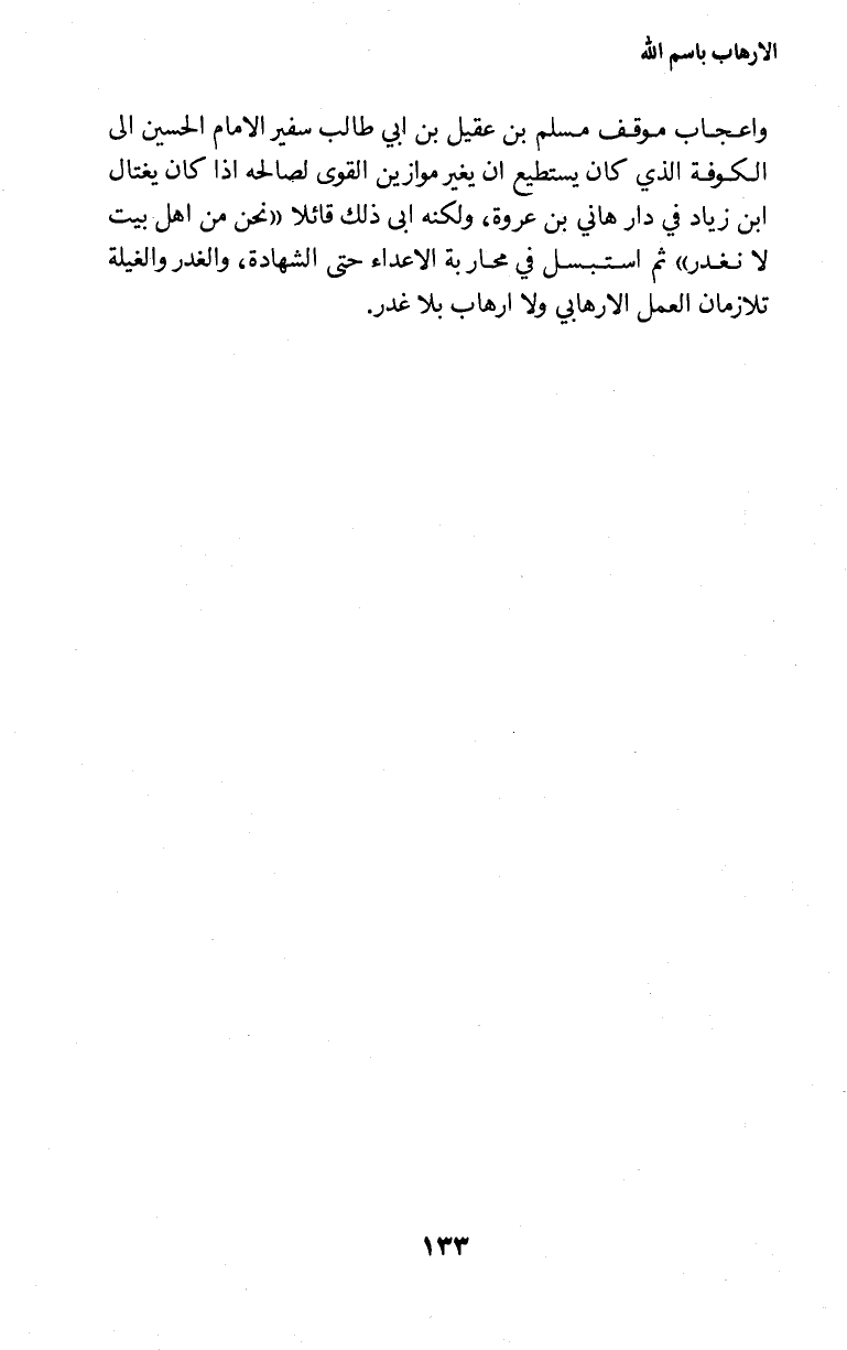 واعجاب موقف مسلم بن عقيل بن ابي طالب سفير الامام الحسين إلى الكوفة الذي كان يستطيع ان يغير موازين القوى لصالحه اذا كان يغتال ابن زياد في دار هاني بن عروة، ولكنه ابى ذلك قائلا " نحن من اهل بيت لانغدر " ثم استبسل في محاربة الاعداء حتى الشهادة، والغدر والغيلة تلازمان العمل الارهابي ولا ارهاب بلاغدر.