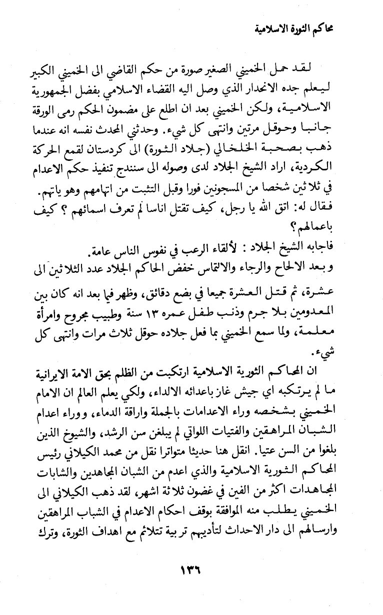 لقد حمل الخميني الصغير صورة من حكم القاضي إلى الخميني الكبير ليعلم جده الانحدار الذي وصل اليه القضاء الاسلامي بفضل الجمهورية الاسلامية، ولكن الخميني بعد ان اطلع على مضمون الحكم رمى الورقة جانبا وحوقل مرتين وانتهى كل شيء. وحدثني المحدث نفسه انه عندما ذهب بصحبة الخلخالي (جلاد الثورة) إلى كردستان لقمع الحركة الكردية، اراد الشيخ الجلاد لدى وصوله إلى سنندح تنفيذ حكم الاعدام في ثلاثين شخصا من المسجونين فورا وقبل التثبت من اتهامهم وهوياتهم.