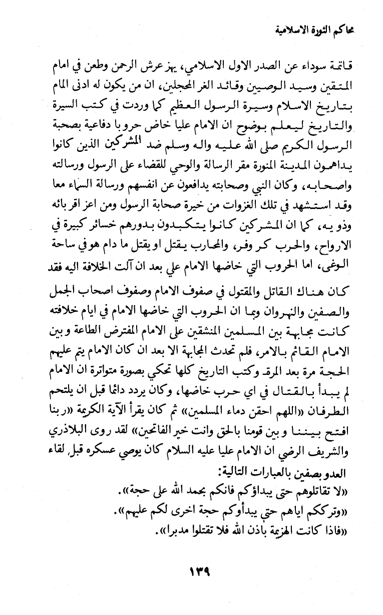 قاتمة سوداء عن الصدر الاول الاسلامي، يهز عرش الرحمن وطعن في امام المتقين وسيد الوصيين وقائد الغر المحجلين، ان من يكون له ادنى المام بتاريخ الاسلام وسيرة الرسول العظيم كما وردت في كتب السيرة والتاريخ ليعلم بوضوح ان الامام عليا خاض حروبا دفاعية بصحبة الرسول الكريم صلى الله عليه واله وسلم ضد المشركين الذين كانوا يداهمون المدينة المنورة مقر الرسالة والوحي للقضاء على الرسول ورسالته واصحابه، وكان النبي وصحابته يدافعون عن انفسهم ورسالة السماء معا وقد استشهد في تلك الغزوات من خيرة صحابة الرسول ومن اعز اقربائه وذويه، كما ان المشركين كانوا يتكبدون بدورهم خسائر كبيرة في الارواح، والحرب كر وفر، والمحارب يقتل او يقتل ما دام هو في ساحة الوغى، اما الحروب التي خاضها الامام علي بعد ان آلت الخلافة اليه فقد كان هناك القاتل والمقتول في صفوف الامام وصفوف اصحاب الجمل والصفين والنهروان وبما ان الحروب التي خاضها الامام في ايام خلافته كانت مجابهة بين المسلمين المنشقين على الامام المفترض الطاعة وبين الامام القائم بالامر، فلم تحدث المجابهة الا بعد ان كان الامام يتم عليهم الحجة مرة بعد المرة وكتب التاريخ كلها تحكى بصورة متواترة ان الامام لم يبدأ بالقتال في أي حرب خاضها، وكان يردد دائما قبل ان يلتحم الطرفان " اللهم احقن دماء المسلمين " ثم كان يقرأ الآية الكريمة " ربنا افتح بيننا وبين قومنا بالحق وانت خير الفاتحين " لقد روى البلاذري والشريف الرضي ان الامام عليا عليه السلام كان يوصي عسكره قبل لقاء العدو بصفين بالعبارات التالية: