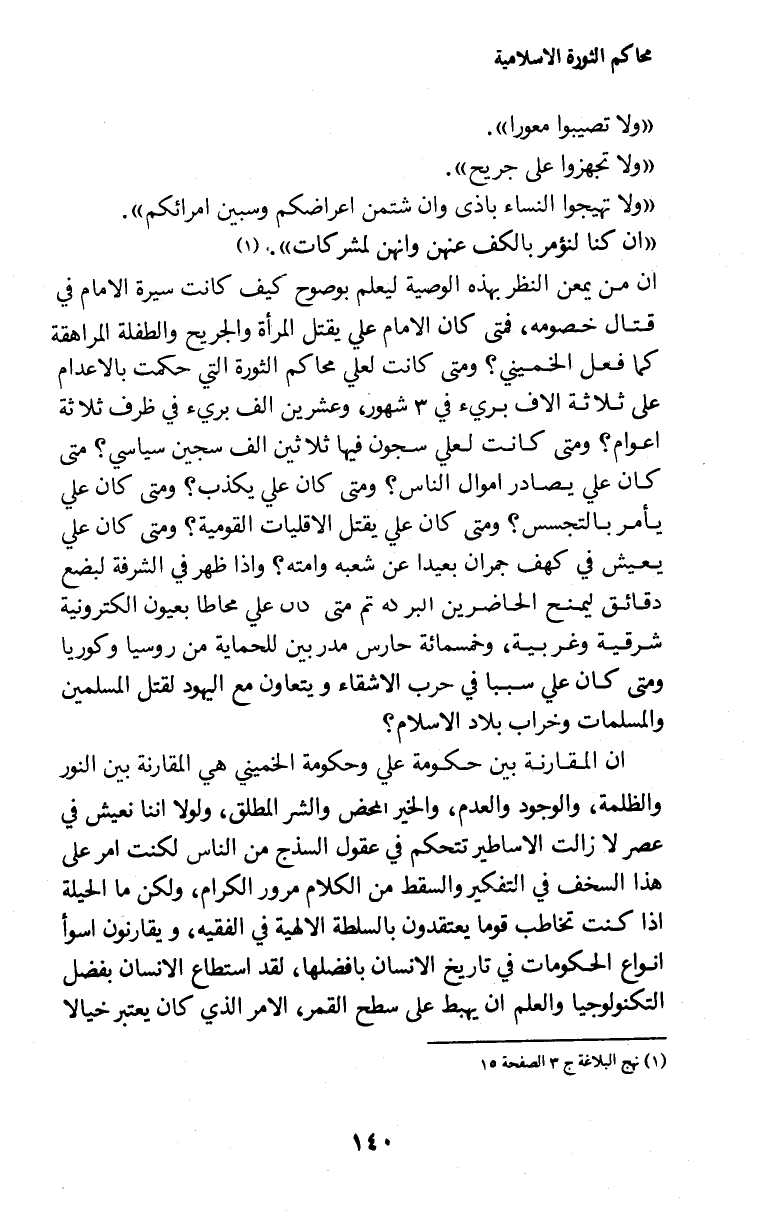 ان من يمعن النظر بهذه الوصية ليعلم بوضوح كيف كانت سيرة الامام في قتال خصومه، فمتى كان الامام علي يقتل المرأة والجريح والطفلة المراهقة كما فعل الخميني؟ ومتى كانت لعلي محاكم الثورة التي حكمت بالاعدام على ثلاثة الاف بريء في 3 شهور، وعشرين الف بريء في ظروف ثلاثة اعوام؟ ومتى كانت لعلي سجون فيها ثلاثين الف سجين سياسي؟ متى كان علي يصادر اموال الناس؟ ومتى كان علي يكذب؟ ومتى كان علي يأمر بالتجسس؟ ومتى كان علي يقتل الاقليات القومية؟ ومتى كان علي يعيش في كهف جمران بعيدا عن شعبه وامته؟ واذا ظهر في الشرفة لبضع دقائق ليمنح الحاضرين البركه تم متى كان علي محاطا بعيون الكترونية شرقية وغربية، وخمسمائة حارس مدربين للحماية من روسيا وكوريا ومتى كان علي سببا في حرب الاشقاء ويتعاون مع اليهود لقتل المسلمين والمسلمات وخراب بلاد الاسلام؟