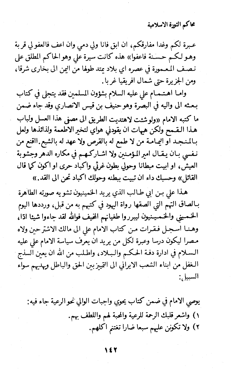 هذا علي بن ابي طالب الذي يريد الخمينيون تشويه صورته الطاهرة بالصاق التهمم التي الصقها رواة اليهود في كتبهم به من قبل، ورددها اليوم الخميني والخمينيون ليبرروا طغيانهم المخيف فوالله لقد جاءوا شيئا ادّا، وهنا اسجل فقرات من كتاب الامام علي إلى مالك الاشتر حين ولاه مصرا ليكون درسا وعبرة لكل من يريد ان يعرف سياسة الامام علي عليه السلام في ادارة دفة الحكم والبلاد، واطلب من الله ان يعين السذج الغفل من ابناء الشعب الايراني إلى التمييز بين الحق والباطل ويهديهم سواء السبيل: