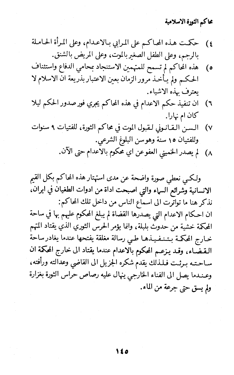 4) حكمت هذه المحاكم على المرابي بالاعدام، وعلى المرأة الحاملة بالرجم، وعلى الطفل الصغير بالموت، وعلى المريض بالشنق.