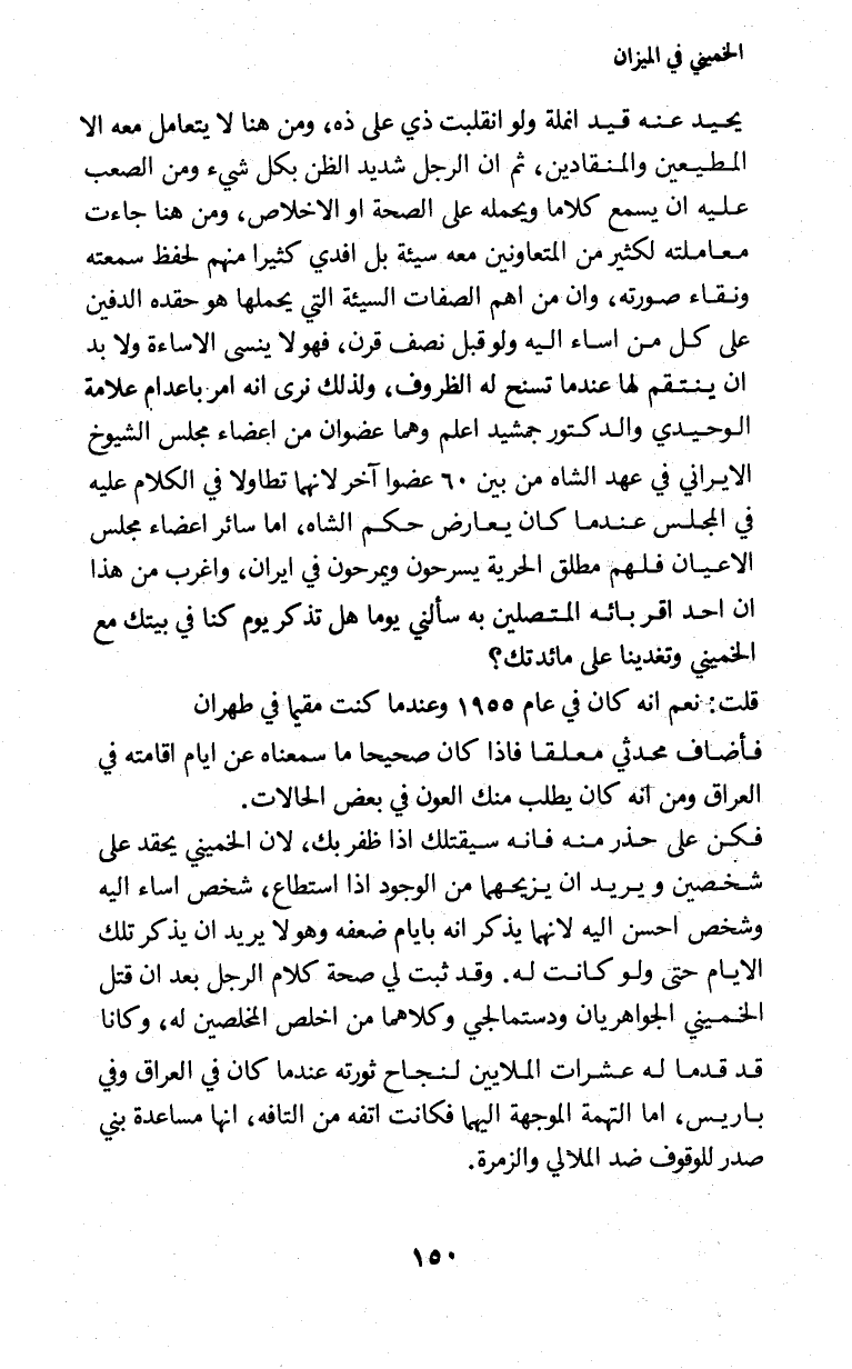 يحيد عنه قيد النملة ولو انقلبت ذي على ذه، ومن هنا لا يتعامل معه إلا المطيعين والمتقادين، ثم أن الرجل شديد الظن بلك شئ ومن الصعب عليه أن يسمع كلاما ويحمله على الصحة أو الإخلاص، ومن هنا جاءت معاملته لكثير من المتعاونين معه سيئة بل اقتدى كثيرا منهم لفظ سمعته ونقاء صورته، وإن من أهم الصفات السيئة التي يحملها هو حقده الدفين على كل من أساء إليه ولو قبل نصف قر، فهو لا ينسى الإساءة ولا بد أن ينتقم لها عندما تسنح له الظروف، ولذلك نرى أنه أمر بإعدام علامة الوحيدي والدكتور جمشيد أعلم وهما عضوان من أعضاء مجلس الشيوخ الإيراني في عهد الشاه من بين 60 عضوا آخر لأنهما تطاولا في الكلام عليه في المجلس عندما كان يعارض حكم الشاه، أما سائر أعضاء مجلس الأعيان فلهم مطلق الحرية يسرحون ويمرحون في إيران، وأغرب من هذا أن أحد أقربائه المتصلين به سألني يوما هل تذكر يوم كنا في بيتك مع الخميني وتغذينا على مائدتك؟