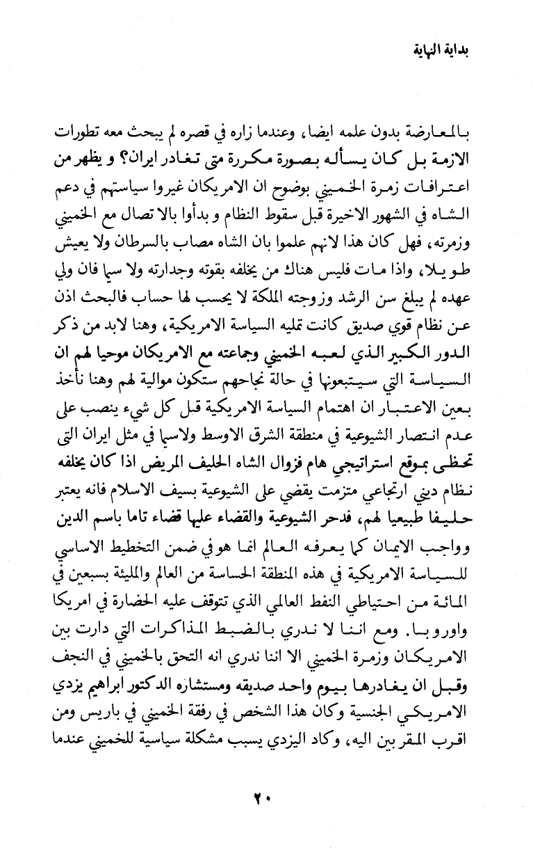 بالمعارضة بدون علمه ايضا، وعندما زاره في قصره لم يبحث معه تطورات الازمة بل كان يسأله بصورة مكررة متى تغادر ايران؟ ويظهر من اعترافات زمرة الخميني بوضوح ان الامريكان غيروا سياستهم في دعم الشاه في الشهور الاخيرة قبل سقوط النظام وبدأوا بالاتصال مع الخميني وزمرته، فهل كان هذا لانهم علموا بان الشاه مصاب بالسرطان ولايعيش طويلا، واذا مات فليس هناك من يخلفه بقوته وجدارته ولا سيما فان ولي عهده لم يبلغ سن الرشد وزوجته الملكة لايحسب لها حساب فالبحث اذن عن نظام قوي صديق كانت تمليه السياسة الامريكية، وهنا لابد من ذكر الدور الكبير الذي لعبه الخميني وجماعته مع الامريكان موحيا لهم ان السياسة التي سيتبعونها في حالة نجاحهم ستكون موالية لهم وهنا نأخذ بعين الاعتبار ان اهتمام السياسة الامريكية قبل كل شيء ينصب على عدم انتصار الشيوعية في منطقة الشرق الاوسط ولاسيما في مثل ايران التى تحظى بموقع استراتيجي هام فزوال الشاه الحليف المريض اذا كان يخلفه نظام ديني ارتجاعي متزمت يقضي على الشيوعية بسيف الاسلام فانه يعتبر حليفا طبيعيا لهم، فدحر الشيوعية والقضاء عليها قضاء تاما باسم الدين وواجب الايمان كما يعرفه العالم انما هو في ضمن التخطيط الاساسي للسياسة الامريكية في هذه المنطقة الحساسة من العالم والمليئة بسبعين في المائة من احتياطي النفط العالمي الذي تتوقف عليه الحضارة في امريكا واوروبا.