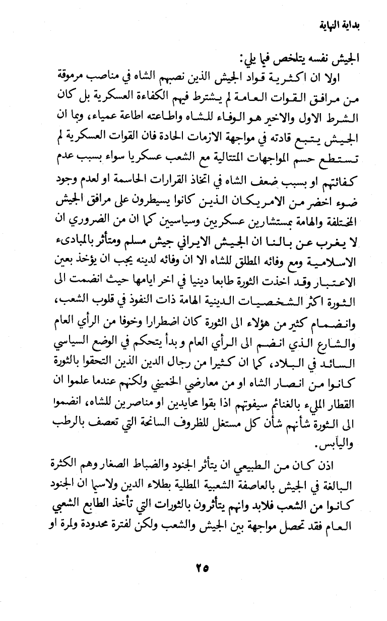اذا كان من الطبيعي ان يتأثر الجنود والضباط الصغار وهم الكثرة البالغة في الجيش بالعاصفة الشعبية المطلية بطلاء الدين ولاسيما ان الجنود كانوا من الشعب فلابد وانهم يتأثرون بالثورات التي تأخذ الطابع الشعبي العام فقد تحصل مواجهة بين الجيش والشعب ولكن لفترة محدودة ولمرة او
