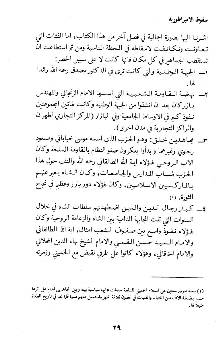 2. نهضة المقاومة الشعبية التي اسسها الامام الزنجاني والمهندس بازركان بعد ان انشقوا من الجبهة الوطنية وكانت لهاتين المجموعتين نفوذ كبير في الاوساط الجامعية وفي البازار (المركز التجاري لطهران والمراكز التجارية في مدن اخرى).