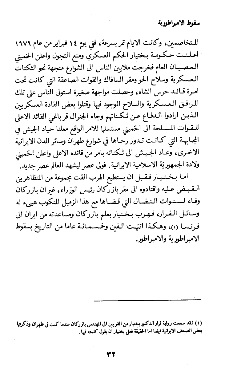 اما بختيار فقبل ان يستطيع الهرب القت مجموعة من المتظاهرين القبض عليه واقتادوه إلى مقر بازر كان رئيس الوزراء، غير ان بازركان وفاء لسنوات النضال إلى قضاها مع هذا الزميل المنكوب هيئ له وسائل الفرار، فهرب بختيار بعلم بازركان ومساعدته من ايران إلى فرنسا (¬1)، وهكذا انتهت الفين وخمسمائة عاما من التاريخ بسقوط الامبراطورية والامبراطور.