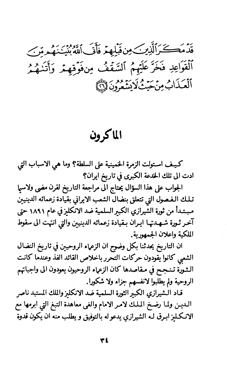 الجواب على هذا السؤال يحتاج إلى مراجعة التاريخ لقرن مضى ولاسيما تلك الفصول التي تتعلق بنضال الشعب الايراني بقيادة زعمائه الدينيين مبتدأ من ثورة الشيرازي الكبير السلمية ضد الانكليز في 1891 حتى آخر ثورة شهدتها ايران بقيادة زعمائه الدينيين والتي انتهت إلى سقوط الملكية واعلان الجمهورية.