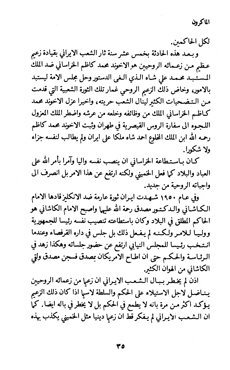 وفي عام 1950 شهدت ايران ثورة عارمة ضد الانكليز قادها الامام الكاشاني والدكتور مصدق رحمة الله عليها واصبح الامام الكاشاني هو الحاكم المطلق في البلاد وكان باستطاعته تنصيب نفسه رئيسا للجمهورية ووليا للامر ولكنه لم يفعل ذلك بل جلس في داره القرفصاء وعندما انتخب رئيسا للمجلس النيابي ارتفع عن حضور جلساته وهكذا زهد في الرئاسة والحكم حتى ان اطاح الامريكان بمصدق فسجن مصدق ولقي الكاشاني من الهوان الكثير.
