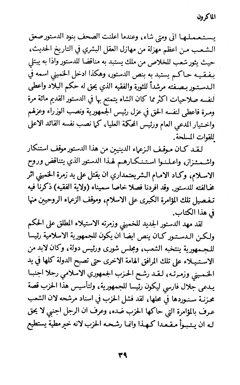 يستعملها انى ومتى شاء، وعندما اعلنت الصحف بنود الدستور صعق الشعب من اعظم مهزلة من مهازل العقل البشري في التاريخ الحديث، حيث يثور شعب للخلاص من ملك يستبد به مناقضا للدستور واذا به يبتلي بفقيه حاكم يستبد به بنص الدستور، وهكذا ادخل الخميني اسمه في الدستور بصفته مرشداأ للثورة والفقيه الذي يحق له حكم البلاد واعطى لنفسه صلاحيات اكثر مما كان الشاه يتمتع بها في الدستور القديم مائة مرة ومرة فاعطى لنفسه الحق في عزل رئيس الجمهورية ونصب الوزراء وعزلهم واختيار المدعي العام ورئيس المحكمة العليا، كما نصب نفسه القائد الاعلى للقوات المسلحة.