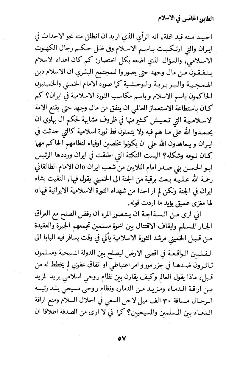 اني ارى من السذاجة ان يتصور المرء ان رفض الصلح مع العراق الجار المسلم وايقاف الاقتتال بين اخوة مسلمين تجمعهم الجيرة والعقيدة من قبل الخميني مرشد الثورة الاسلامية يأتي في وقت يسافر فيه البابا إلى الفلبين الواقعة في اقصى الارض ليصلح بين الدولة المسيحية ومسلمون ثائرون ضدها في جزر مورو امر اعتباطي واتفاق عفوي لم يخطط له من قبل، ماذا يقول العالم وكيف يقارن بين نظام روحي اسلامي يريد المزيد من اراقة الدماء ومزيد من الدمار، ونظام روحي مسيحي يشد رئيسه الرحال مسافة 30 الف ميل لاجل السعي في احلال السلام ومنع اراقة الدماء بين المسلمين والمسيحيين؟ كما اني لا ارى من الصدفة اطلاقا ان