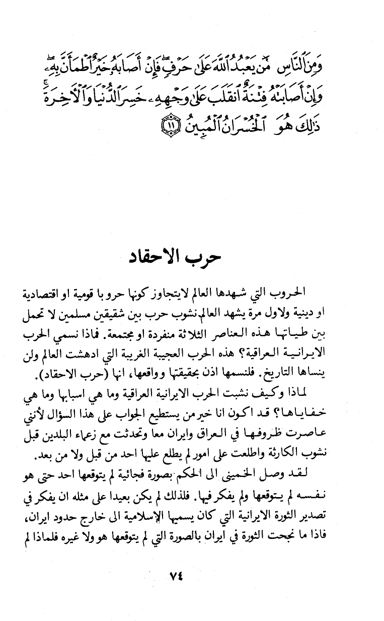 الحروب التي شهدها العالم لايتجاوز كونها حروبا قومية او اقتصادية او دينية ولاول مرة يشهد العالم نشوب حرب بين شقيقين مسلمين لاتحمل بين طياتها هذه العناصر الثلاثة منفردة او مجتمعة. فماذا نسمي الحرب الايرانية العراقية؟ هذه الحرب العجيبة الغريبة التي ادهشت العالم ولن ينساها التاريخ. فلنسمها اذن بحقيقتها وواقعها، انها (حرب الاحقاد).